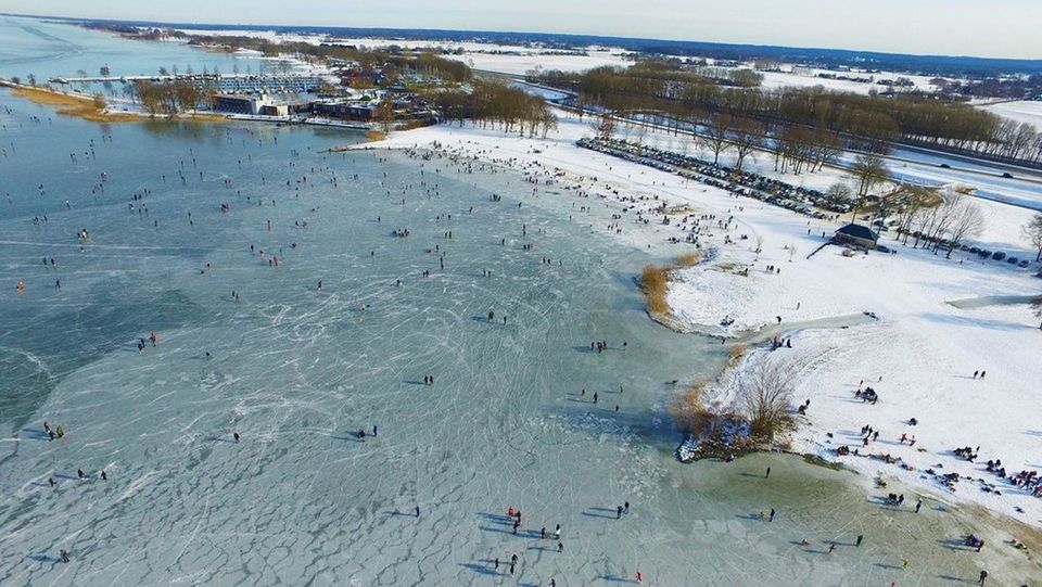 Nergens in Nederland kun je schaatsen zoals op Strand Nulde! Op het ondiepe water aan het strand ligt al snel een ijslaag die dik genoeg is en veel oppervlakte heeft. Zoals je op de foto’s ziet is er ruimte voor heel veel mensen en die ruimte is ook nodig. Strand Nulde is namelijk enorm geliefd om het unieke uitzicht op Flevoland, dat zich aan de horizon bevindt. Terwijl je samen met vele anderen gezellig schaatst kun je daar eindeloos van genieten. De fijne ligging langs de snelweg en de goede parkeermogelijkheden maken dit, ook praktisch gezien, een perfecte plek voor een dagje schaatsplezier!